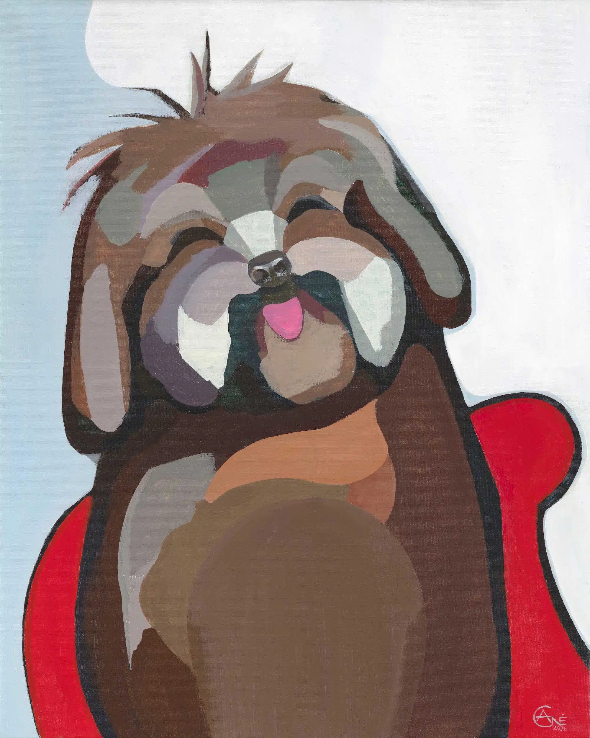Paveikslas, įkvėptas mano naujo augintinio. Jame norėjau perteikti tai, kas mane jame labiausiai žavi – jo naivų, atvirą žvilgsnį, nuolat gerą nuotaiką ir tą besąlygišką džiaugsmą būti. Šis šuo man atrodo tarsi mažas gyvenimo priminimas apie paprastą laimę, žaismę ir gebėjimą kasdienybę priimti lengviau.